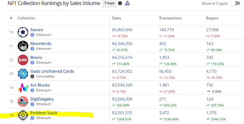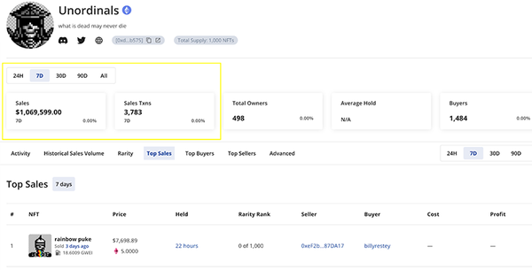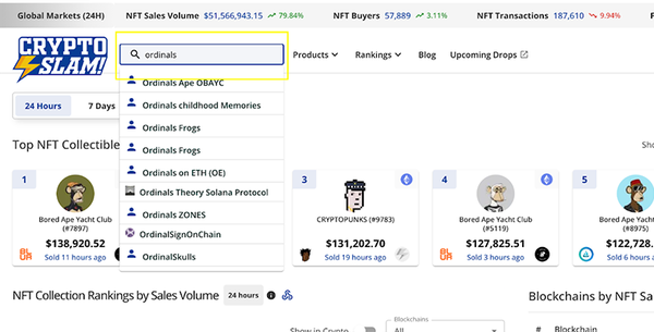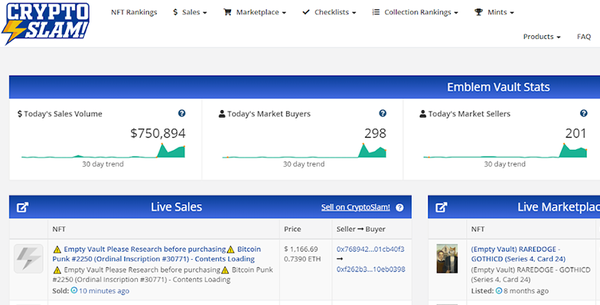 they compare to Ethereum NFTs We will eventually be tracking more Ordinal volumes, but if you want to see what’s currently going on for yourself, there are several collections on CryptoSlam that show what decisions are being made by buyers interested in this new market category. One such example is Emblem Vault. Take a look at the last 7 days chart from our front page. There’s been over $3 million dollars traded. Emblem Vault wraps Bitcoin NFTs and bridges them to Ethereum where they can be traded on Ethereum based marketplaces. Bitcoin NFTs, which were actually first on the scene going back to 2014-2016 on the Namecoin, and Counterpary networks, or reimagined as an Ordinal can be wrapped and traded in this Ethereum collection. Drill down here to find out if the NFT was a wrapped Counterparty asset, or a wrapped Ordinal, as you can sort of tell what they are by the NFT name. This is not 100% fool proof and people can wrap something that is not the actual asset being represented in the name, so verification steps are necessary, and I suspect each buyer is researching the wrapped asset before buying. Source Other Ordinal collections can be found on our Rankings by searching “Ordinals” in the search bar or tracking Ordinal collections that have started on ETH and looking to bridge to Bitcoin,