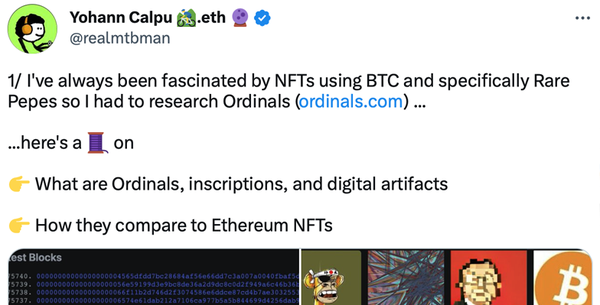 The NFT community has once again innovated and thrown a curveball to collectors and NFT enthusiasts in recent weeks. Lots of chatter about Bitcoin NFTs have taken the space by storm and has the largest blockchain by market capitalization and its community simultaneously “up-in-arms” with anger, and reeling from excitement about a potential killer use case for the “boomer” blockchain. I wrote a thread here which breaks down the emerging technology and explains: ⚡What are Ordinals, inscriptions, and digital artifacts ⚡How