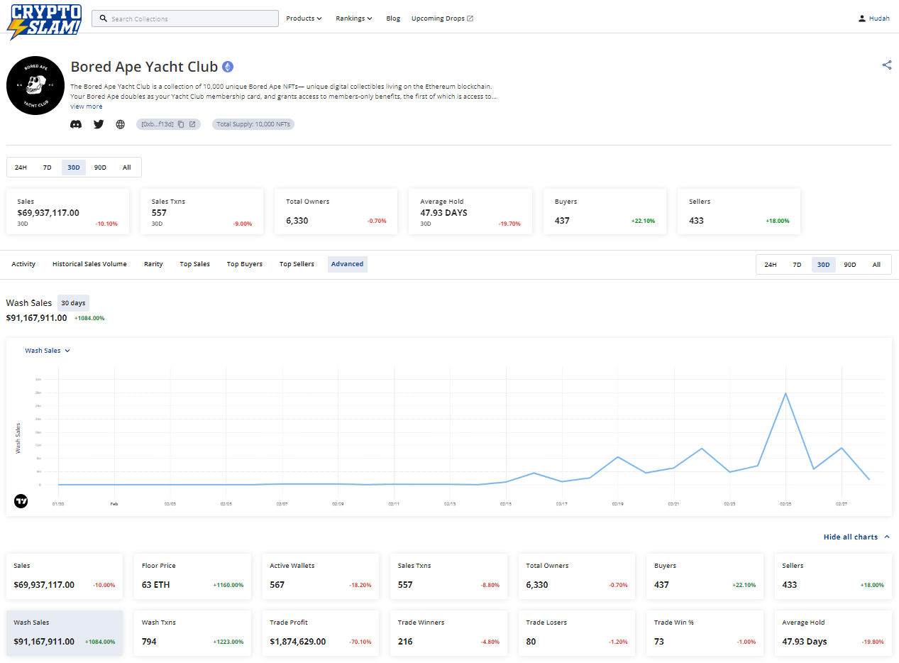 be able to easily identify wash trades, so CryptoSlam.io gives you a few ways to distinguish between legitimate trades and wash sales. By marking individual wash sales with a wash icon, you’re now able to identify illegitimate sales as you browse collections’ activity feeds. With our TradingView-powered charts, you can now visualise wash trades as they happen, giving you significant dates and volumes at a glance. Finally, we provide a USD total value of wash trades in a collection based on the terms you