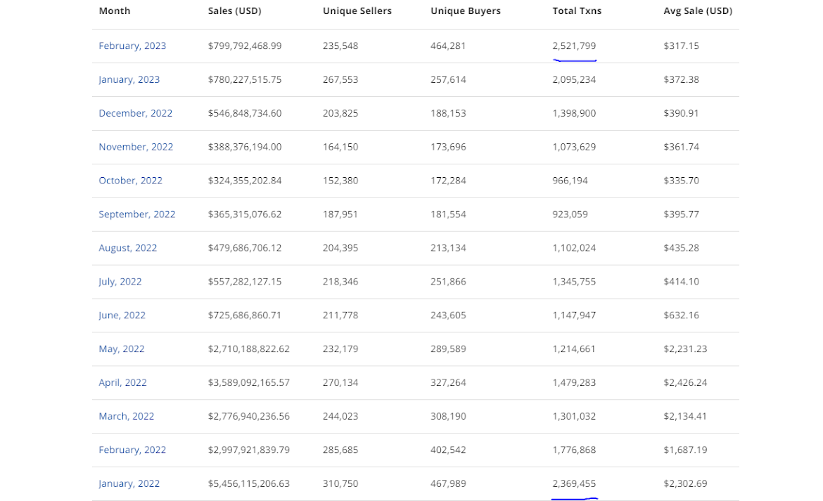 away mixing it up with collectors at NFT Paris last week, the traders stayed home to play, pushing NFT volume to heights not seen since January 2022. Before you get too excited and tweet your “I’m thinking we’re back” meme, I just have to tell you, there’s more to this story than meets the eye. We’ve done a little early spring cleaning at CryptoSlam and hosed down the past few weeks of NFT sales data to reveal what’s