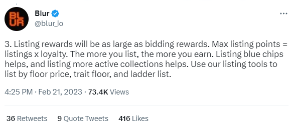 airdrop, largely by mass listing and bidding on NFTs to fulfill Blur’s #1 rule; “The more you list, the more you earn”. Source Although wash trading, token farming, and everything in between are part of the