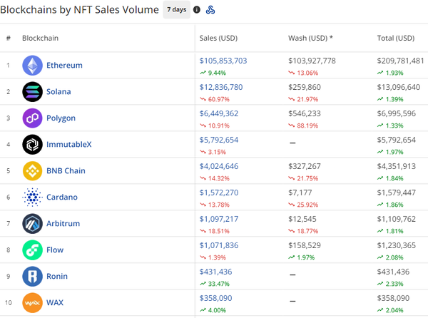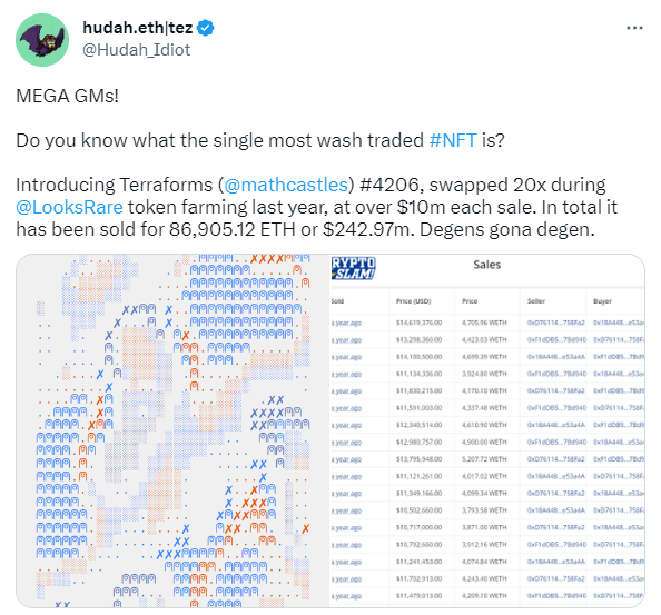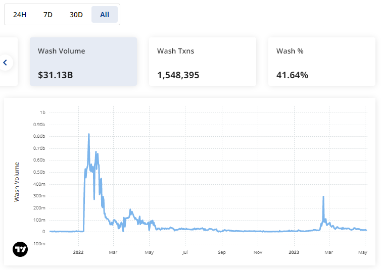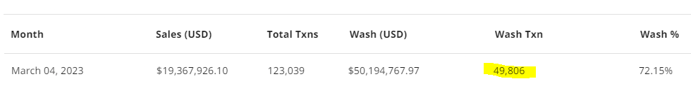 cryptoslam.io to get a breakdown of sales vs wash sales along with a total USD value, number of transactions, and total wash percentage. Putting these tools to use we can look at