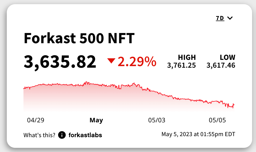end there, and I’ve written about the extent of wash trading recently on Forkast News. The TLDR is, wash trades make up a significant percentage of monthly transactions, and are still largely driven by traders farming points on the Blur marketplace. While the NFT market faces a significant downturn made more complicated by wash trades, it is important to measure both organic growth and wash trades. Systems can be gamed, but the numbers don't lie; NFTs have grown into a multi-billion dollar market. Analyzing all sales allows clarity into the growth of Web3 as new technology and products are born using decentralized platforms, game theory, DAOs, and yes, even wash trades. The Forkast 500 NFT Index excludes wash sales to provide an accurate measure of the NFT market’s value. While the total USD volume of global sales has been up in the past 7 days, the Forkast 500, with wash sales removed, shows the NFT market actually losing value and is down over 2%. Have a MEGA GM, Slam Fam, and May the force be with you! |