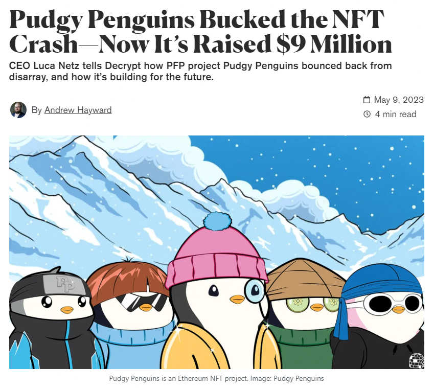 a future edition of On Deck. The Bitcoin ecosystem seems to be in “up only” mode right now, and when that will end nobody knows. Ribbit. The Pudgy Penguins project had two announcements this week that added to their feel-good story. First, they announced a new partnership with WME talent agency that brings them closer to movies, games, and other mainstream entertainment. Then the adorable crew followed that up with an announcement that they have raised $9m in seed