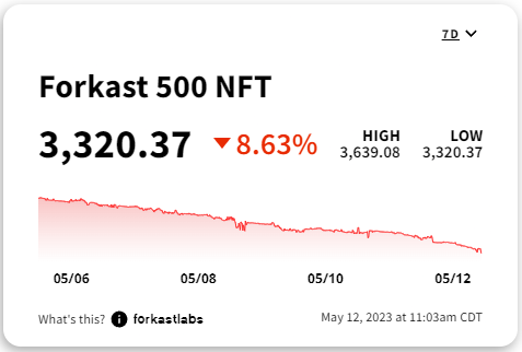 funding. Not bad for a project that was circling the drain before being purchased by the marketing master Luca Schnetzler (Gel Blaster, Vibe Body Care, Cookies n Kicks). The Pudgy Penguins’ NFT sales probably didn’t have much of an impact on the market, but the positive news coming in the thick of a bear market was a welcomed bright spot that just for a moment reminded us all that there is real growth happening here. Here’s where things get interesting, and if you are a regular reader of On Deck, you already know this re-occurring topic. The Forkast 500 NFT Index reflects the NFT market losing over 8% this week. Yes, high gas fees are largely to blame, but we can’t minimize the effect that the NFT casino continues to play. Traders are still trading the way we’ve come to expect, as out with the old and in with the new has become the degen’s creed. Established projects have continued to lose value and volume, as traders favor the