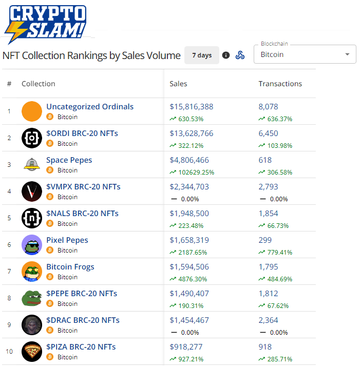 Musk was preparing a rocket launch this week, but that’s exactly what happened when he tweeted a meme from the Milady Maker’s NFT community that has now been viewed over 32m times. Sales of Milady NFTs exploded and carried the rest of the market with them to a height of $217m in sales volume this week. Binance integrated Bitcoin NFTs into their marketplace, giving Ordinals a new way to reach the masses without needing to be a technical wizard to trade them. NFTs on the OG blockchain were red hot, with a new flavor of Ordinal called BRC-20s picking up momentum. BRC-20s are Bitcoin’s version of Ethereum’s meme coins, but at their core, they’re also like an NFT collection. We’ll give a technical breakdown of these new Bitcoin Ordinals in