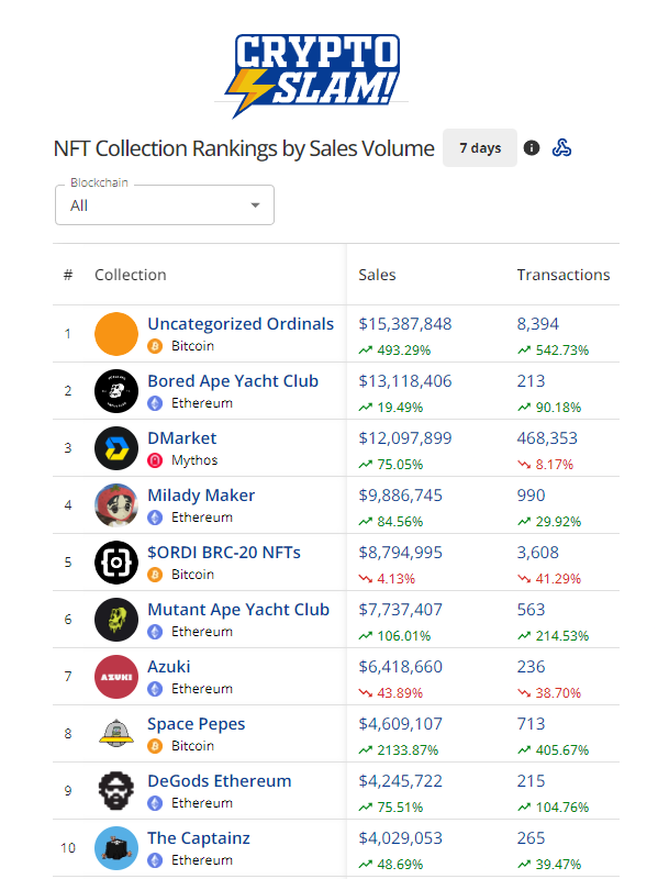 past 30 days Bitcoin’s Ordinals and BRC-20s have turned the OG blockchain into the blockchain with the second-highest sales volume in the world. Bitcoin NFTs are just getting started and in the long run I expect Bitcoin to compete head to head with Ethereum’s all-time sales. It may actually exceed them too. Mythos Chain is also doing big numbers, as people are beginning to take notice of the gaming blockchain and their impressive products. I’m a gamer and