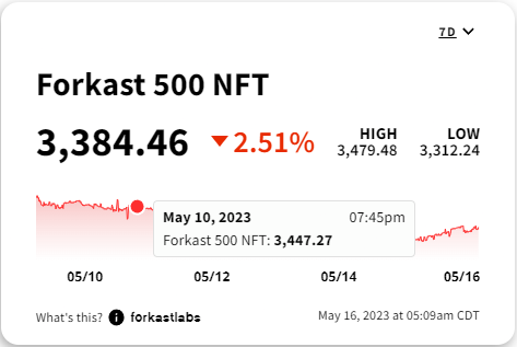 and filling our brains with all of the latest happenings in NFTs. It’s going to be a special time and we’re hoping to get to meet some of you there! I’m expecting markets to be slow while many are off networking, but we also know that degens are gona degen. Keep your eyes on cryptoslam.io, the Forkast 500 NFT Index, and our ETH, Solana, Polygon, and Cardano composites to see how the market is affected when many in the space take a break from trading. In the past 7 days the Forkast 500