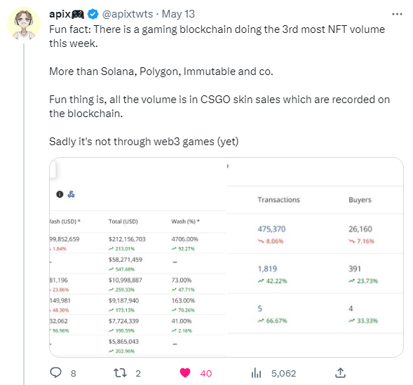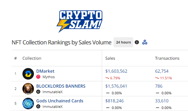 didn’t know until recently that they have the world’s largest CS:GO skins secondary market along with new hit NFL Rivals, Blankos Block Party and more on the horizon. At the time of this writing, 3 of the top 10 collections in 24 hours are all gaming NFTs, and the biggest game makers
