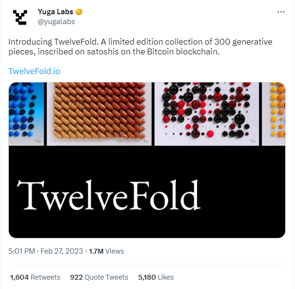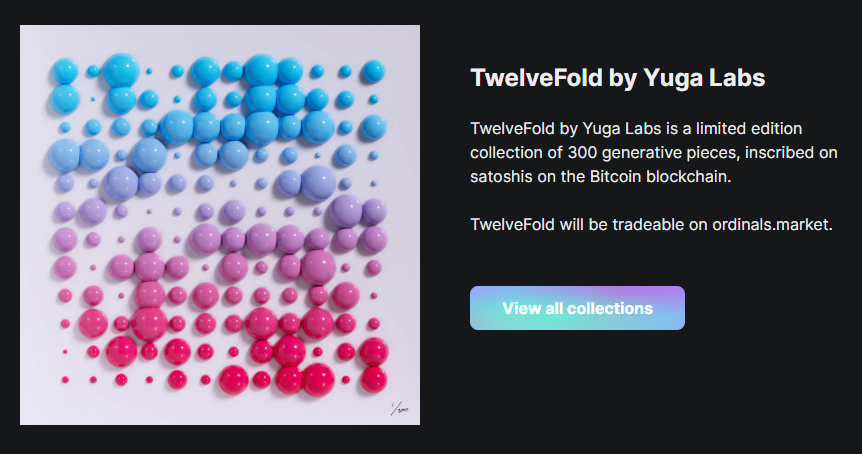 words. Yuga’s new collection called TwelveFold was released on Sunday on https://twelvefold.io/ and consists of 300 individual works of 3D-rendered art, with some hand-drawn components. They look nice enough, but even if art heads find them lacking (raises hand), the tech and provenance more than makeup for it. Inscribed on the blockchain itself, the TwelveFold NFTs will be preserved forever on-chain and showcase one of