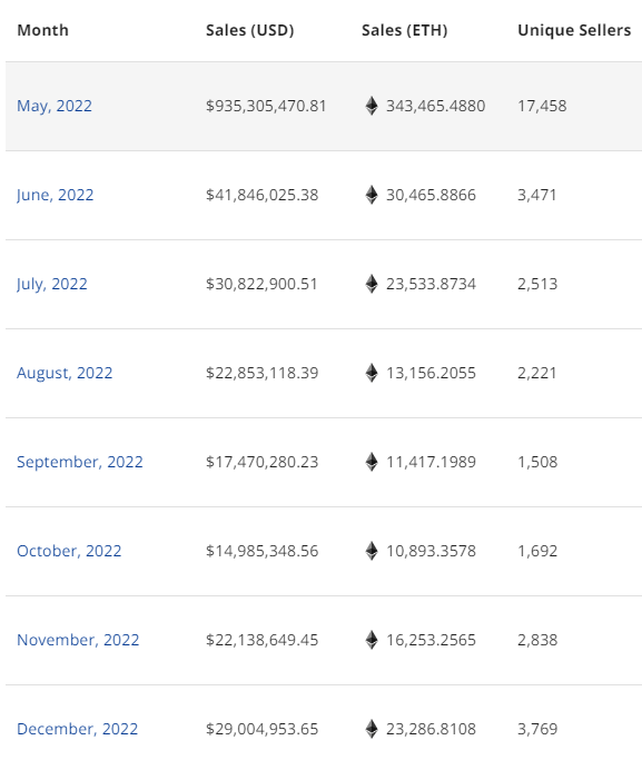 – Source The top was once again a Yuga Labs NFT, this one called Otherdeeds. In total, Otherdeed NFTs saw close to $1b in secondary volume in May 2022. Otherdeed NFT historical sales – Source (MEGA Disclaimer: This is not financial advice. I am not a trader, I am simply an enjoyer. The NFT
