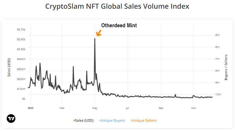 Source For months on end, traders couldn’t collect enough NFTs, until the top of the market was ultimately found. That top was Yuga Labs’ mint of the Mutant Ape Yacht Club NFTs on