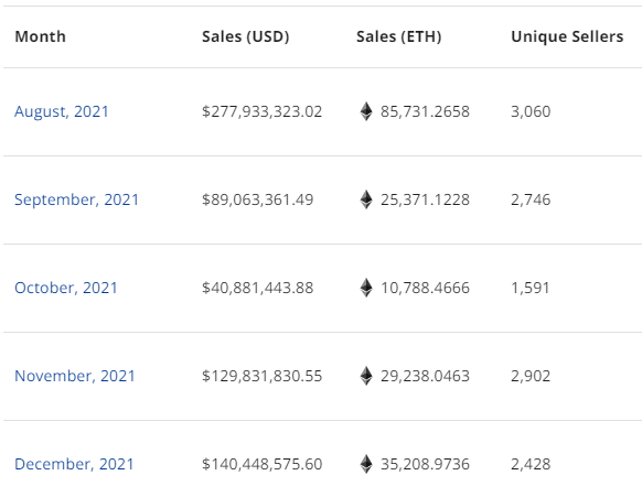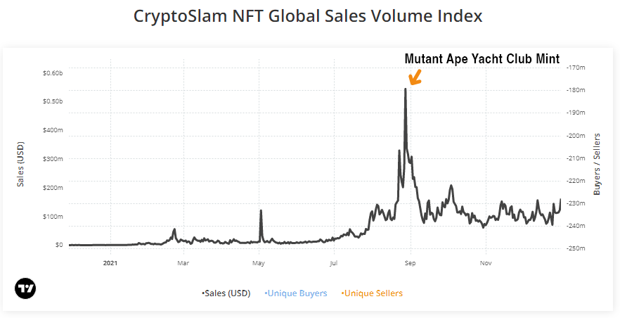 8/28/21. Global NFT Sales Volume - Jan ‘21 - Dec ‘21 – Source In the month of August alone, the Mutant Ape Yacht Club traded over $277m on secondary markets. Mutant Ape Yacht Club historical sales – Source Following the Mutant Ape mint, the NFT markets remained active, but uneventful for months. That changed in