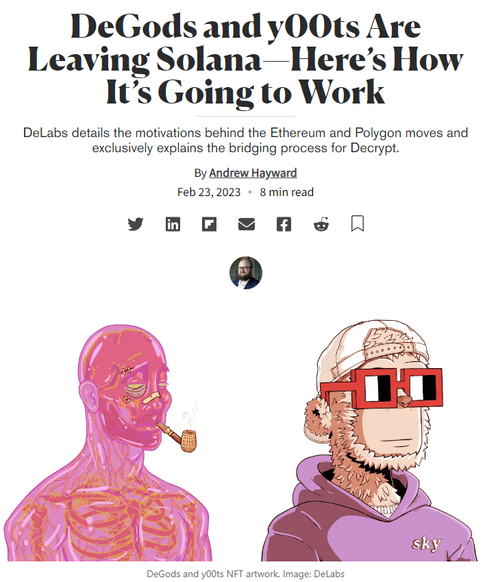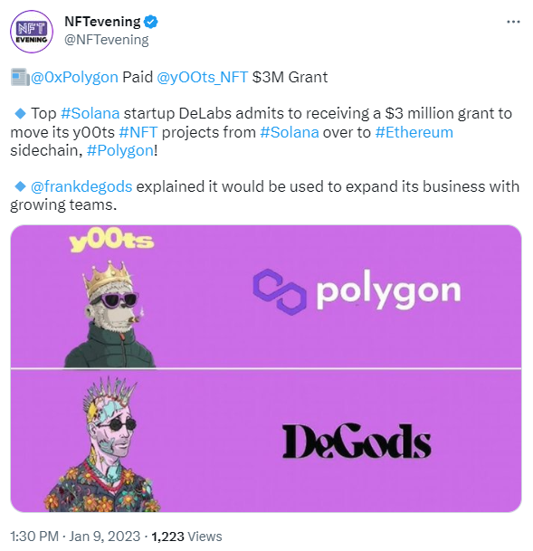 announced their plans to move from Solana to Ethereum and Polygon. To say it was controversial is an understatement. Add in the fact that DeLabs (the parent project of both projects) was given a $3m grant for DeGods’ move to Polygon and you can see why Solana collectors felt betrayed. The Ethereum
