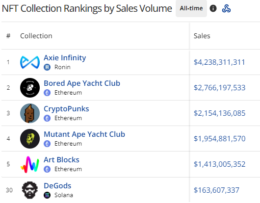 Solana based on sales volume, it still only ranks #30 across blockchains. NFT Collection Rankings by Sales Volume – Source Comparing DeGods to Azuki (Rank 8 in