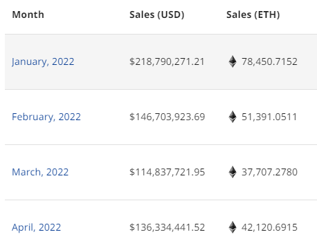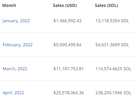 all-time sales volume) gives us some more direct insight into what a top Solana project vs a top Ethereum project looks like, and shows us the potential that could be on the horizon for these migrating projects. At its peak, DeGods traded for $25m in April 2022, and that same month Azuki boasted a whopping $136m in sales. (Sales figures