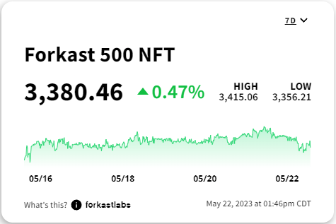 which now represent 3 of the top 10 collections. BAYC has been dethroned for now, with 2 Ordinals projects and Mythos Chain’s DMarket all outselling the NFT community's favorite apes. Speaking of Bitcoin, the OG blockchain continues to do serious numbers, now firmly holding the #2 position on the Blockchain by NFT Sales Volume leaderboard each day. The 3-10 spots are where we see plenty of jockeying for position as gaming NFT-heavy chains like Solana, Mythos, Immutable X, and Polygon all continue to grow their respective market shares. Wash trading, while down 7%, still represents almost 50% of all NFT sales on Ethereum. NFT Forkast The Forkast 500 NFT Index is up .1%, trading close to even, thanks primarily to the Ethereum NFT ecosystem propping up the global ecosystem. While Solana, Cardano, and Polygon are all down, the Forkast ETH NFT Composite is up over 2%