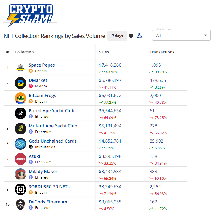 - Another Bitcoin project holds the top NFT Collection Ranking by Sales spot for the past 7 days, as Space Pepes has traded almost $7.5m in secondary