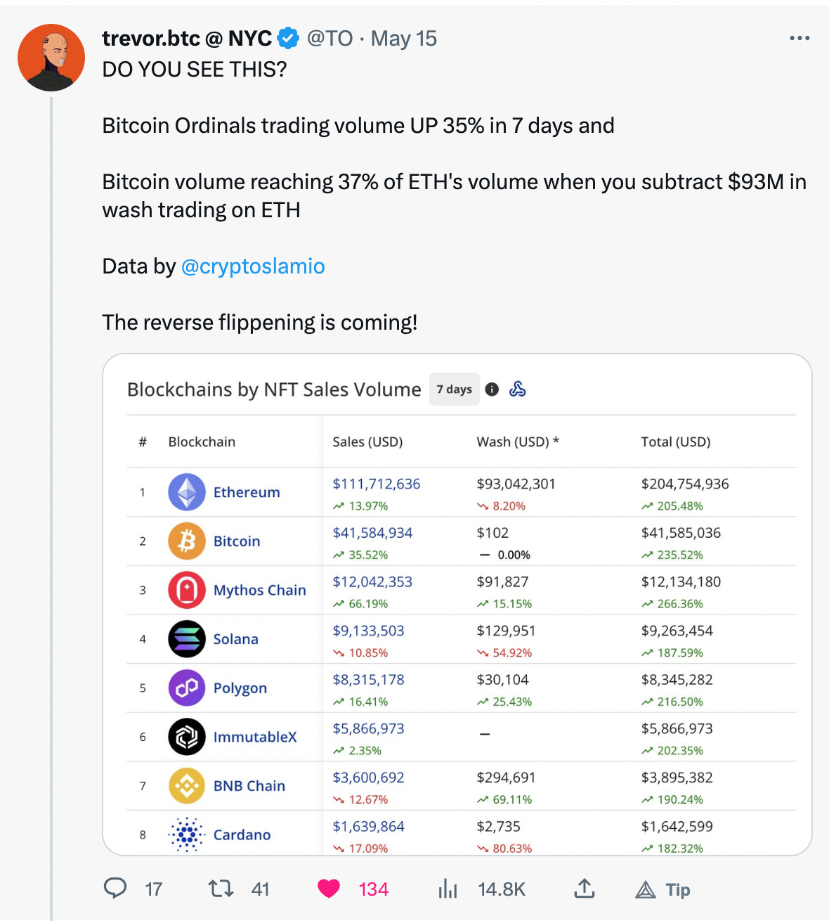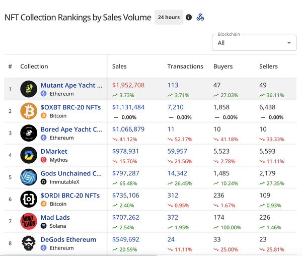 tokens like $ETH and $BTC. The latest rankings on CryptoSlam.io show that $OXBT and $ORDI are in the top 10, indicating the rapid rise of Bitcoin in the scene. Personally, I have never seen an ecosystem boot up this fast, except for NFTs in 2020-2021, and I would argue that it's even moving faster this time around. The Bitcoin currency market cap is more than double the Ethereum currency market cap ($500B+ vs $200B+) and the BTC protocol may be better suited to certain types of NFTs, ones that see immutability
