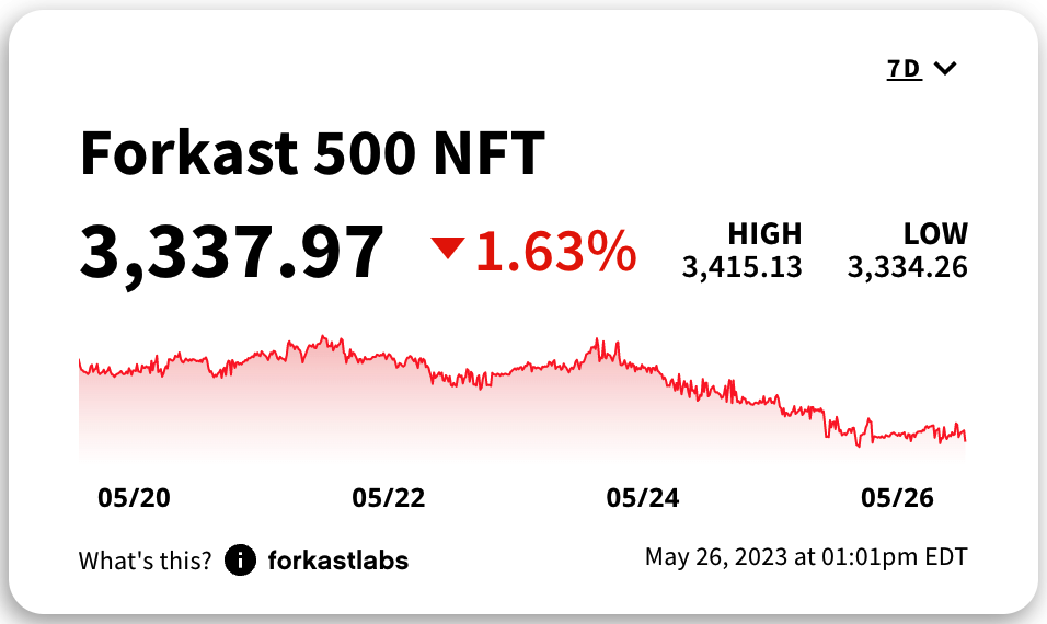 can’t drive the Forkast 500 NFT Index into positive territory this week. As a whole, the NFT markets are down nearly 1.5% in the past 7 days, reflecting traders focusing their efforts on the Bitcoin and Ethereum