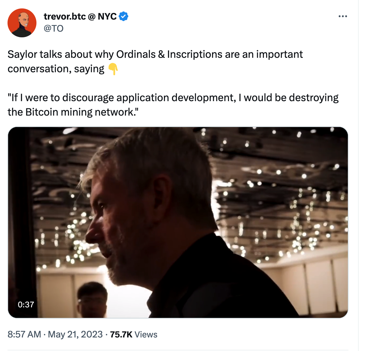 and scarcity as features instead of weaknesses. Fundamentally, there is a big difference forming between what we are seeing on ETH and what we are seeing on BTC. The community is splitting into people who value UX, and corporate partners and one who values ultimate security/scarcity and immutability. While I think there are strengths to each, there IS a place for both. Net new people are coming into the "NFT" ecosystem, even if they will only trade Ordinals on BTC or BRC-20s, and they are really small in numbers, they are net new people. What will happen when the Michael Saylor’s of the world see the value in Ordinal theory, and it’s burgeoning use cases on BTC…well here he is: The NFT ecosystem, while can be seen as splitting, is actually growing and innovating, and while Taylor Swift fans are not coming in en masse, the core set of people who see the future of this technology are more excited about the growth of this
