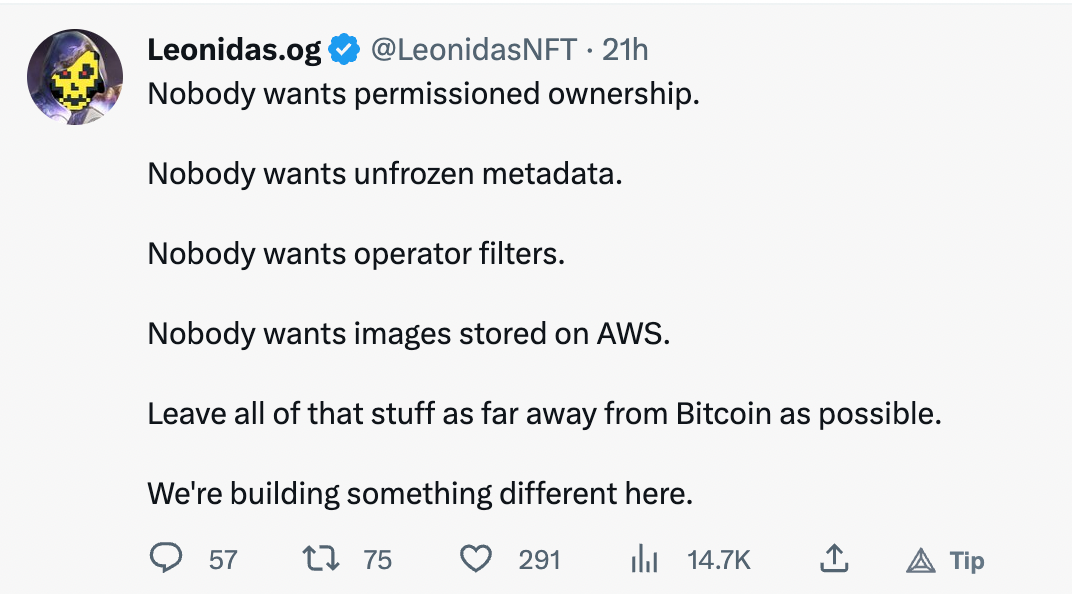 the moment. He posed a great question in return, "Is the BTC community even supporting Ordinals?" It’s a great question to be honest. In Miami, it seemed that the main theme revolved around the "Laser-eyed maxis" who view BTC as a single-use case: "Better money" and a store of value that shouldn't be tampered with. On the other hand, the new Ordinal crew, represented by individuals like @rodarmor, @TO, @LeonidasNFT, and @udiwertheimer, are leading the charge on alternative use cases such as digital artifacts (NFTs) and BRC-20s, which are the bitcoin equivalent of fungible