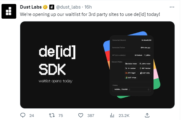 - Frank DeGods announced a new Dust Labs product called De[id] that features wallet delegation for wallet security, and Twitter connectivity that allows holders to be auto-followed/unfollowed by official DeGods and Y00ts accounts.