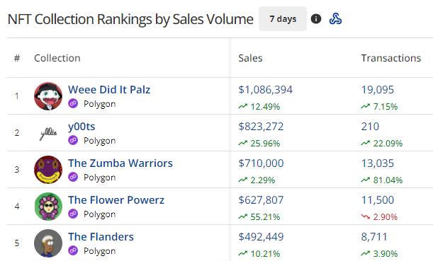 - Polygon is having a big week and has been lifted to the #3 spot on the Blockchain Rankings thanks to newcomers called Weee Did It Palz, The Zumba Warriors, and The Flower Powerz collections.