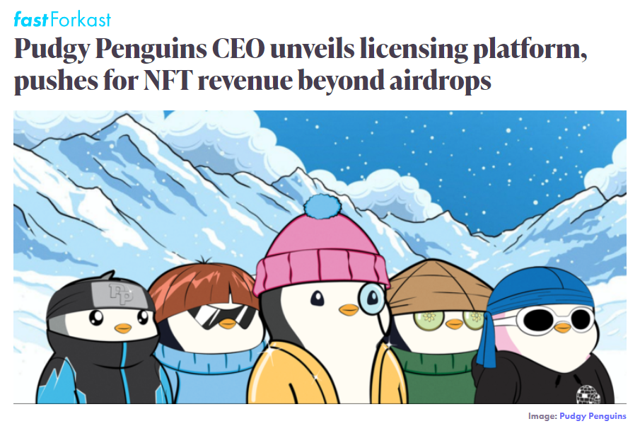 ripping, and there are some major developments coming related to IP licensing for NFT holders. With everything happening in the news these stories were easy to miss, so let’s get you caught up. - Pudgy Penguins’ owner Luca Netz was on the NFT Now podcast and talked about an upcoming new NFT IP licensing platform he’s releasing in the next few weeks called Overpass. Pudgy Penguins holders will be able to connect with entities who want to license their NFT, and with a few clicks of a mouse, will take part in the future of licensing.