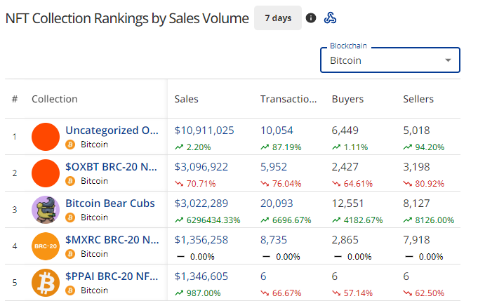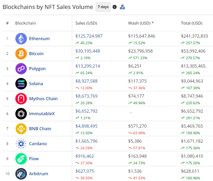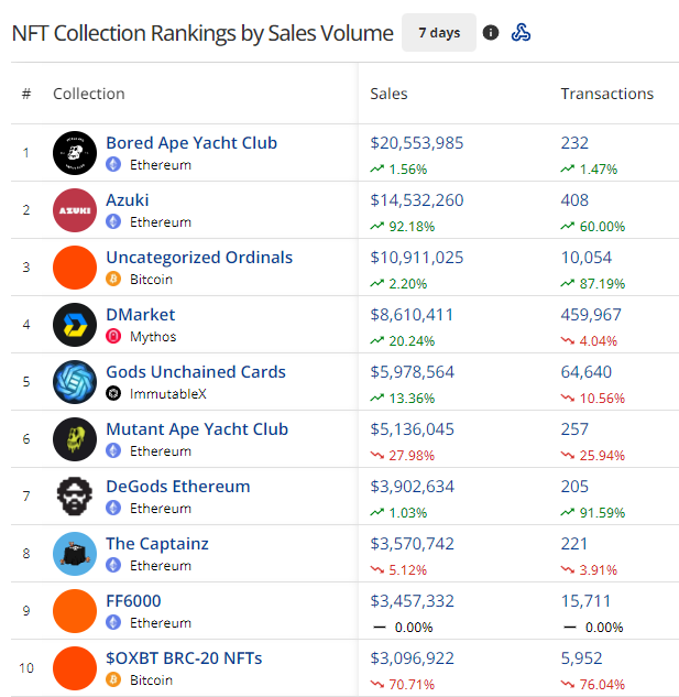 - Bitcoin still holds onto number 2 and seems to be on auto-pilot. More traders are being onboarded into the Ordinals ecosystem as the appeal of taking part in the early days of the historic chain’s NFT scene becomes