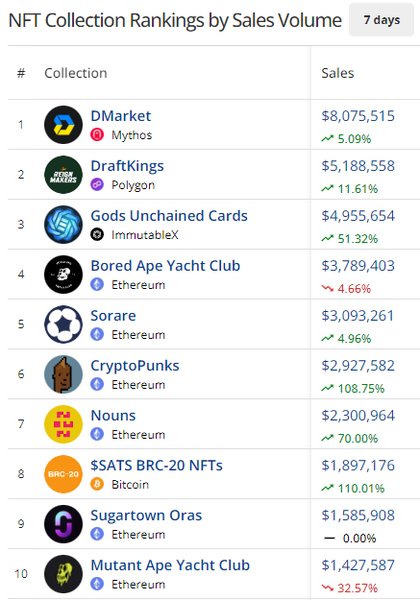 - DMarket, DraftKings, Gods Unchained, and Sorare (The Four) just dominating the top 5 collections this week. You know the story: huge supply, low cost, high volume collections with mass appeal (gaming skins, fantasy sports, and gaming assets). This is the winning formula for NFTs.