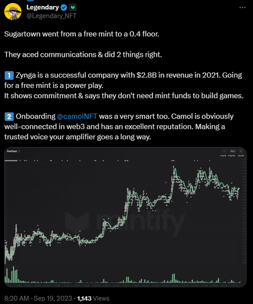 price they settle on, collectors want little to do with it. Remember Wreck League failed to mint out their NFTs priced at .19 eth, and more recently Nakamigos were FUDed to oblivion with their announcement of a .05 ETH mint. Maybe there’s no price collectors are willing to mint at today, so making them free is key. The real question about Zynga’s mint is what makes them so special that collectors are chasing them at this price on secondary, with 4k NFTs from the collection still remaining to be minted. Mystery, untold potential and the opportunity for endless speculation are the secret ingredients of NFT prices. Always were, and maybe always will be. Zynga is teasing that Sugartown isn't just an NFT for one game, but instead the key to their broader NFT gaming ecosystem. Without a clear roadmap, there’s plenty to speculate on, so collectors can let their imaginations run wild with what the NFTs will do, and are driving up the prices