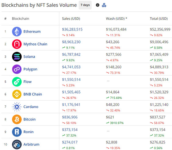 - Ethereum sales are down 9.14% this week to $36m, and washtrading continues