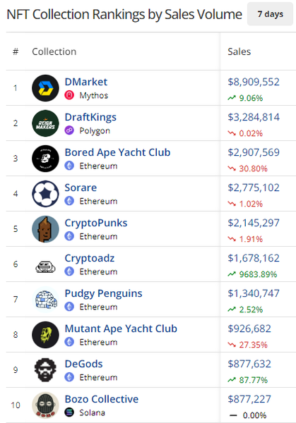 - DMarket and their gaming skin NFTs (CounterStrike, DOTA2, etc) saw over $8.9m in sales, again outperforming the #2 and #3 ranked collections combined.
