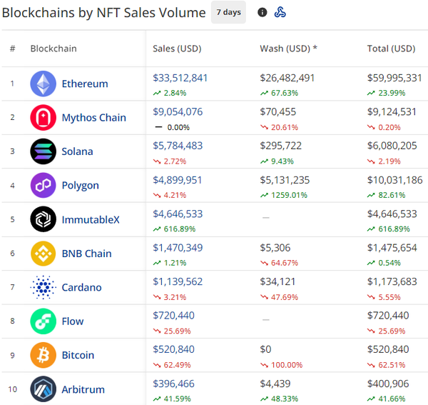 - Ethereum NFTs saw a 67% increase in wash sales in the past 7 days, driven
