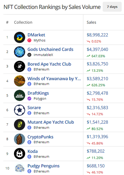 - DMarket again dominates the Top Collection Rankings on CryptoSlam with $8.9m in sales, while new NFT mints climbed 21%, and trade profits rose 9% to $308,177 on the week.