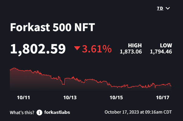 The Forkast 500 NFT Index as expected is showing the NFT market’s continued loss of value, down -3.61% in the past seven days. Broken down by blockchain we see that Cardano is down -0.22%, Ethereum -0.64%, Solana -3.32%, and Polygon -6.26%. As NFT traders ramp up their adoption of SoFi platforms and fractionalized assets, expect to see them liquidate their NFT assets in favor of greener pastures elsewhere. Have a MEGA