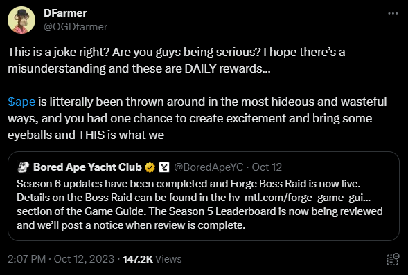 - Yuga Labs announced their HV-MTL Forge game’s rewards of 89k $APE, and after huge