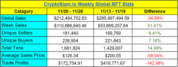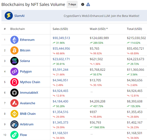 the blockchains when it comes to NFTs. Sales are up over 31% from last week, but it’s Bitcoin’s drop that really pushed Ethereum to the top. Wash sales have returned in full force with a whopping $124m in wash sales in the past 7 days.