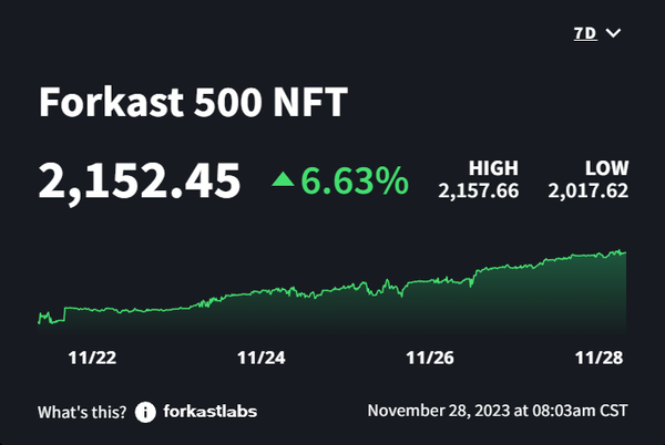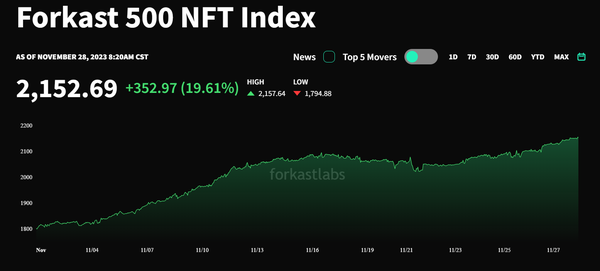 get excited for any short-term market action. Fortunately, they aren’t just not losing value, they’re gaining value in a significant way. November is currently on pace to be the best performing month for the value of the NFT market ever, with the Forkast 500 NFT index reflecting a 19.61% increase this month.