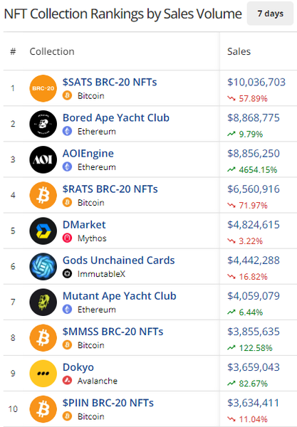 - BRC20s aren’t going anywhere, and still, this week represent 4 of the top ten NFT collections. $SATS BRC20s