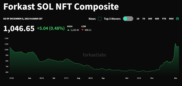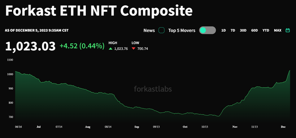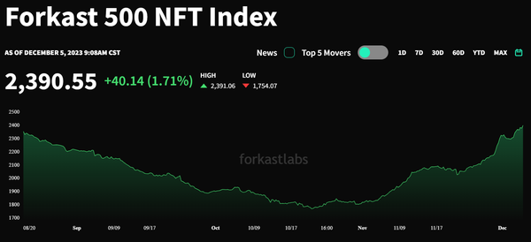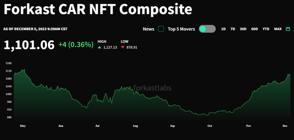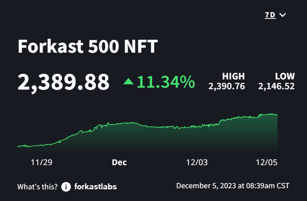 The Forkast 500 NFT Index has basically lived in the green for the past 8 weeks now. This week the NFT ecosystem has gained another 11.34% in value, and from the start of the market turnaround (around Oct 20), it is up nearly 34%.