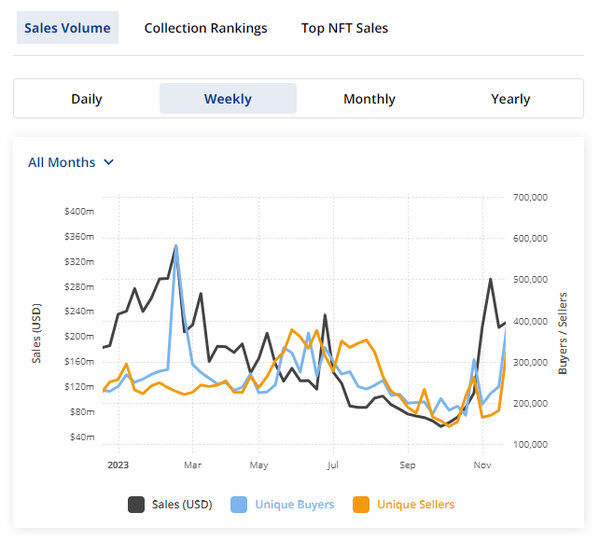 showing that traders are stirring. Still, it’s fair to wonder if NFTs are actually back, or if we are seeing nothing more than some short-term volume after some traders finally got liquidity. This week, we got our answer. Sales volume has clearly come rushing back, pushing November to be the fourth-best