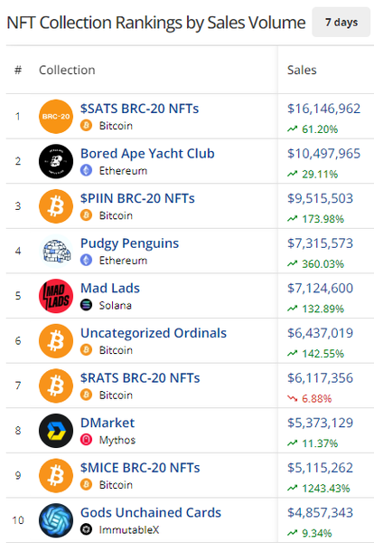 - BRC20s and Ordinals are seeing a huge spike again this week, thanks to Bitcoin’s hitting its highest price in over 18 months.