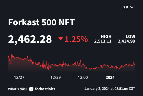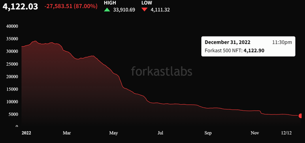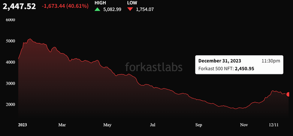 The Forkast 500 NFT Index is now down for the third week in a row. Fret not, up only is just a meme, and it was a matter of time until traders started really taking profits. We also have to consider that December is a heavy month for tax-loss harvesting, so sellers frequently sell their pricey NFTs for
