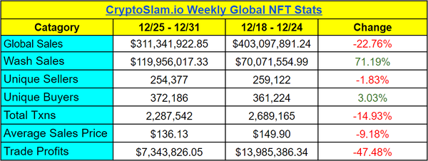NFT sales, unique sellers, total transactions, average sale price, and trade profits all were down from the previous week, as traders mostly let off the gas during the holidays. Now with a fresh new year ahead of us, the promise of airdrops, rewards, and Bitcoin ETF approval, the runway is looking clear for takeoff. Feeling bullish? Good, so are we.