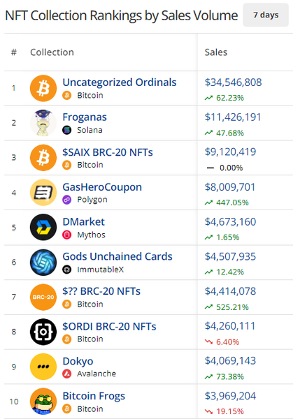 - NodeMonkes on Bitcoin are pushing the Ordinals collection to the #1 spot this week, while BRC20s, and Bitcoin Frogs have Bitcoin holding down 6 of the Top Ten spots. In total, Bitcoin collections in the Top Ten