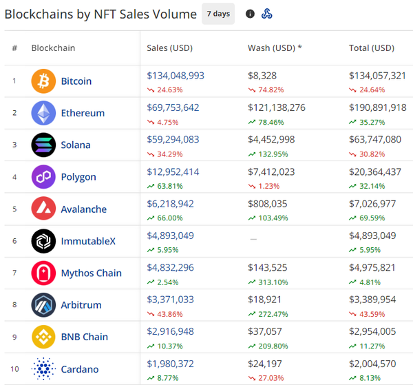 - Ethereum climbed back to the #2 spot even with declining sales. Ethereum NFTs sold for $69.75m, down just 4.75% from last week compared to Bitcoin and Solana’s huge double-digit drops.