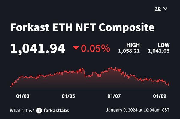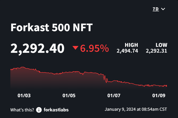 The Forkast 500 NFT Index has now fallen for the fourth week in a row, this week down -6.95%. A sign of lower volume, and lowering prices for NFTs combined, traders are still just playing the waiting game as anticipation for the Bitcoin ETF continues to ramp up. Tomorrow could be a make-or-break day for the NFT market, and even if the ETF is approved, expect NFTs not to pick up steam until the dust has settled after the initial stampede. Have a MEGA GM and I’ll see you again next week!
