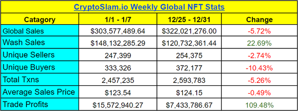 Global sales, sellers, buyers, and transactions all fell last week. Trade profits, however, one of the most important metrics, were up over 2x last week. Remember, if traders are winning, they’ll keep trading. For now, all eyes are fixed on WHERE traders are trading. Last month traders shifted heavily from Ethereum to Bitcoin and Solana. In fact, in December, Solana NFTs outsold